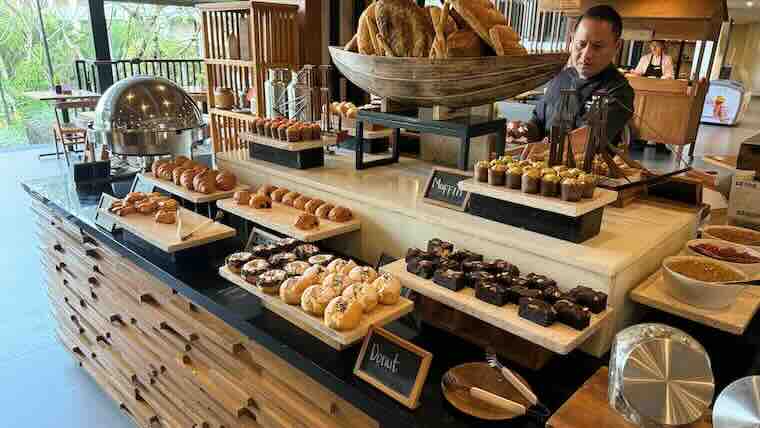 - 朝食ブレッドコーナー。焼きたてパンの香りが広がる。
