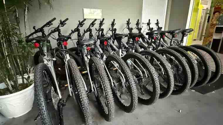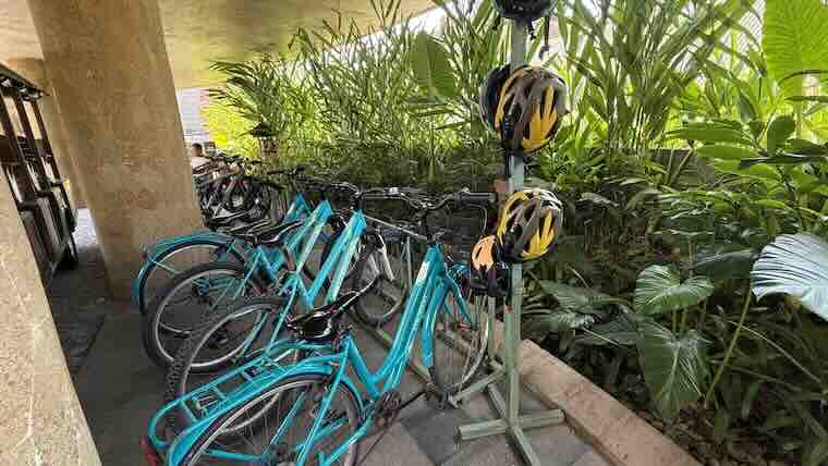 - 無料レンタサイクルが並ぶ。ウブド散策に便利。
