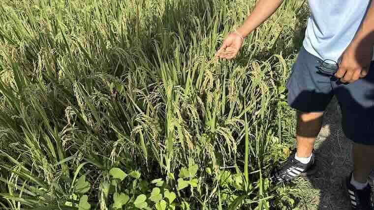 - ガイドが稲穂を指さす。黄金色に輝くお米。
