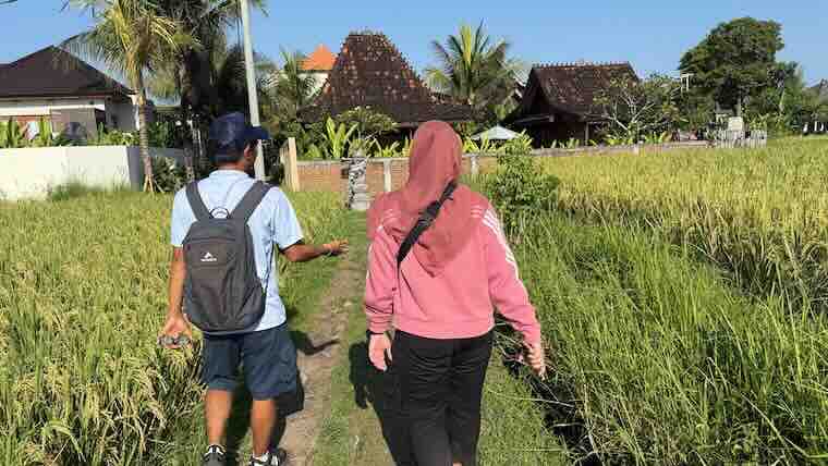 - ガイドと歩く田んぼの畦道。お米の収穫が近い時期。